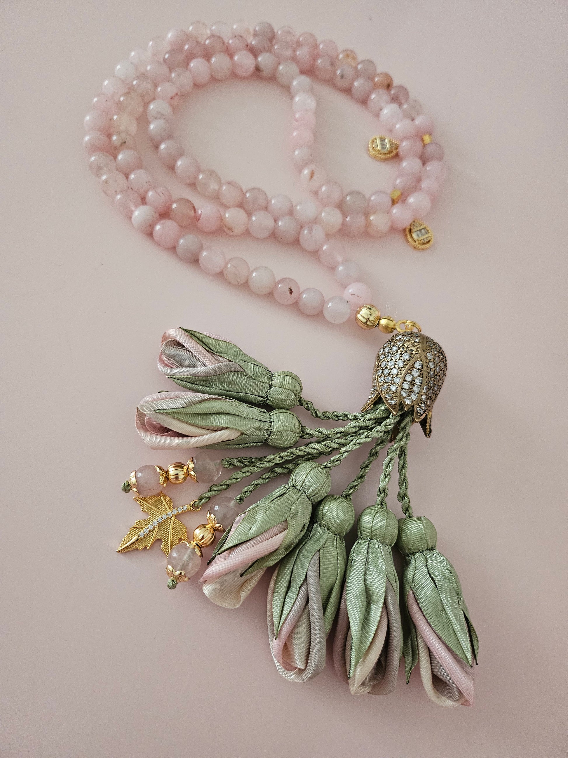 PRE-ORDER - طلب مسبق Pink Quartz Natural Stones/ Ombré Dusky Pink & Beige Tulips [الكوارتز الوردي - حجر الحب] تستغرق مدة التنفيذ ٢-٣ أسابيع على الأقل تنويه: قد تختلف ألوان أو بعض اكسسوارات المنتج قليلاً عن الصور